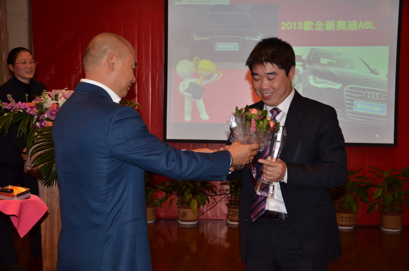 聚会盛大表扬了公司历史上首个年度董事长卓越孝顺奖和年度董事长优异孝顺奖,,,,,药品销售公司总司理王军民获得年度董事长卓越孝顺奖,,,,,上虞bet365亚洲唯一官网总司理朱志斌和总司理助理周林获得年度董事长优异孝顺奖,,,,,董事长吕钢亲自宣读颁奖词,,,,,并为他们揭晓奖品,,,,,年度董事长卓越孝顺奖奖品为2013款全新奥迪A6L,,,,,年度董事长优异孝顺奖奖品为欧米茄De ville 2013新款手表。。。。。。。