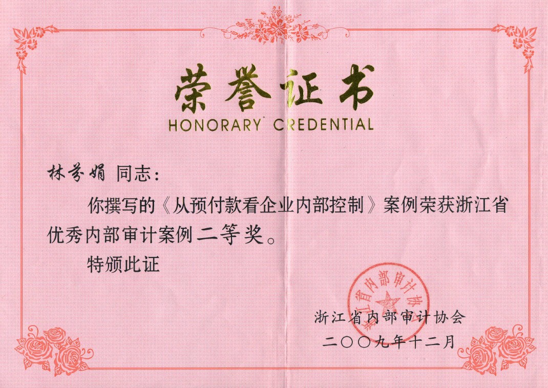 克日,,,,,,,,从绍兴市内部审计师协会传来喜讯,,,,,,,,审计部选送的《由一件工程舞弊案件引发的思索》荣获浙江省内审案例评选二等奖、市内审案例评选一等奖。。。。。。。。同时,,,,,,,,转达还表扬了2009年度优异内审项目,,,,,,,,审计部的《2009年1-7月药品销售公司退货情形审计》项目获得市内审项目二等奖。。。。。。。。之前,,,,,,,,审计部司理林芬娟撰写的《从应收款看企业内部控制》一文,,,,,,,,也一经获得过浙江省内部审计案例二等奖。。。。。。。。