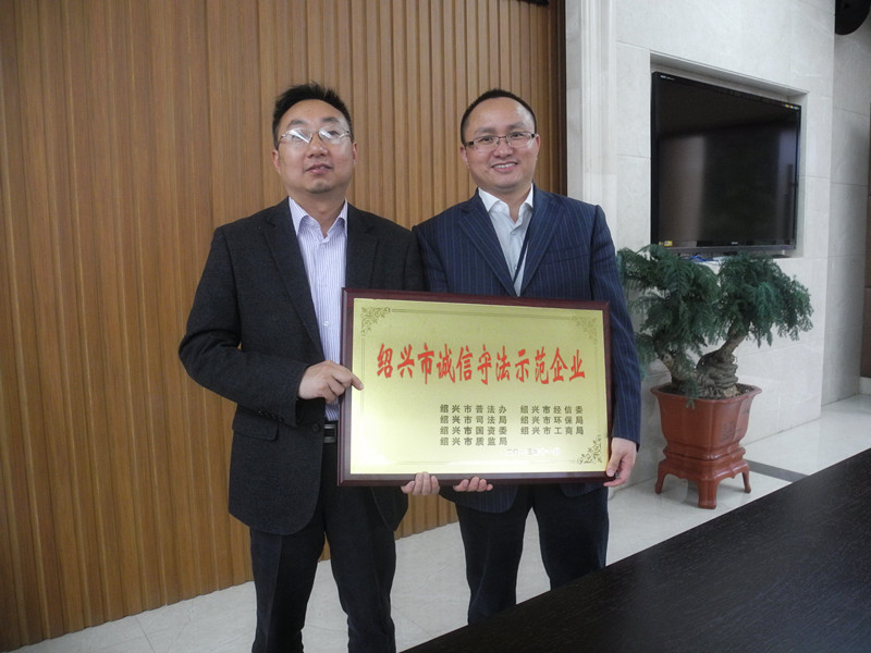 公司一直坚持忠实守信,,,,,依法谋划原则,,,,,经绍兴市普法办、绍兴市经信委、绍兴市司法局、绍兴市环保局、绍兴市国资委、绍兴市工商局、绍兴市质监局等7家部分团结评审,,,,,2013年11月被评定为绍兴市“诚信遵法树模企业”。。。。。