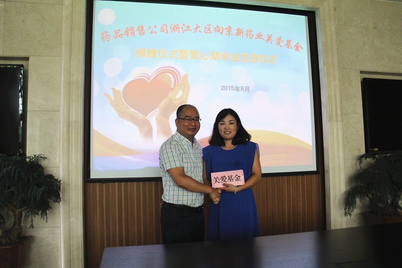 8月7日上午,,,,,一场简短而温馨的仪式在公司行政楼一楼聚会室举行。。。。。药品销售公司刘顺军司理代表浙江大区全体干部员工将12000元部分运动经费捐赠给公司“关爱基金”,,,,,并将其中4000元资助给公司2名难题同事的子女上大学,,,,,工会主席何苏红和2名学子接受了这凝聚着浓浓爱心的款子。。。。。