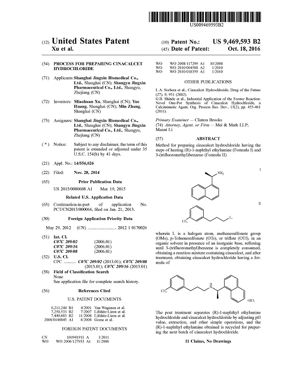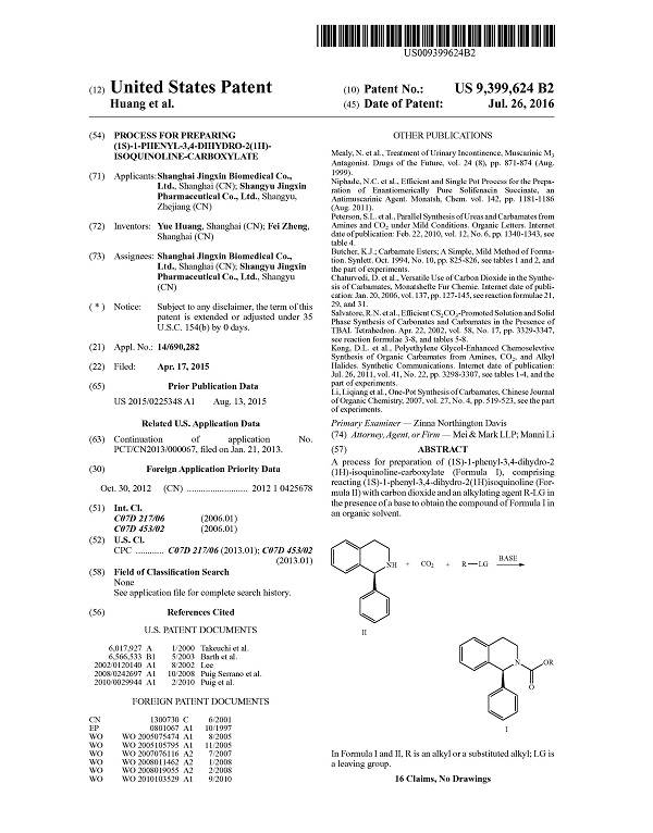 克日,,,,,,公司的PCT专利申请:PROCESS FOR PREPARING (1S)-1 -PHENYL-3,4-DIHYDRO-2(1H)-ISOQUINOLINE–CARBOXYLATE获得美国专利商标局(USPTO)揭晓的发明专利授权证书。。。。。。。。专利授权通告号US9399624,,,,,,为公司首件通过PCT途径获得外洋授权的发明专利。。。。。。。。