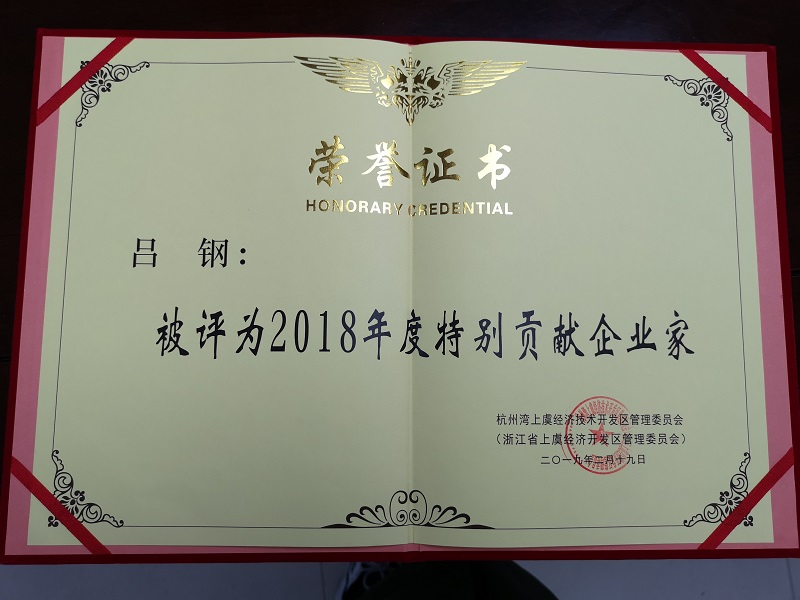 2月19日,,,,,杭州湾上虞经济手艺开发区召开“聚焦项目、大抓落实”暨“三服务”推进大会。。。。 。 。。。公司董事长吕钢荣获上虞经济手艺开发区"2018年度特殊孝顺企业家”称呼。。。。 。 。。。